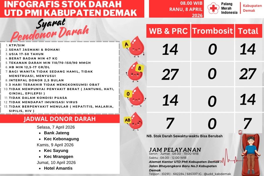 DEMAK - Palang Merah Indonesia (PMI) Kabupaten Demak merilis informasi terbaru terkait ketersediaan stok darah di Unit Transfusi Darah (UTD), Rabu (8/4/2026) pukul 08.00 WIB. Dari data tersebut, stok darah masih tergolong terbatas di semua golongan.